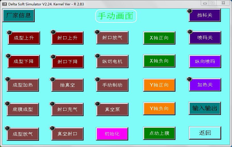 拉伸膜真空包裝機【手動畫面】主要用于機器的手動操作,有【廠家信息】【輸入輸出】兩個切換畫面,有【加熱開】【噴碼開】【擋料開】三個開關鍵和一個【初始化】按鍵。還有【成型上升】【成型下降】等二十個點動觸摸鍵。如下圖: